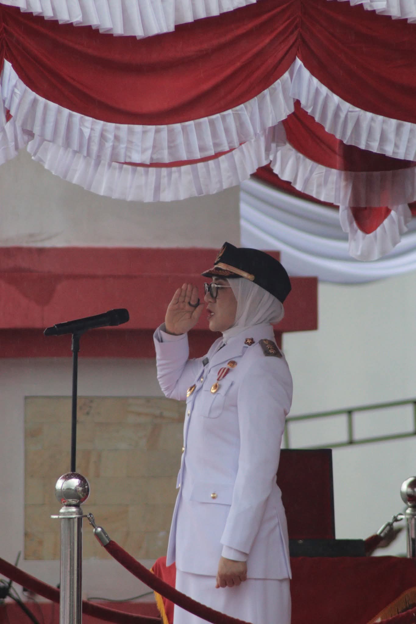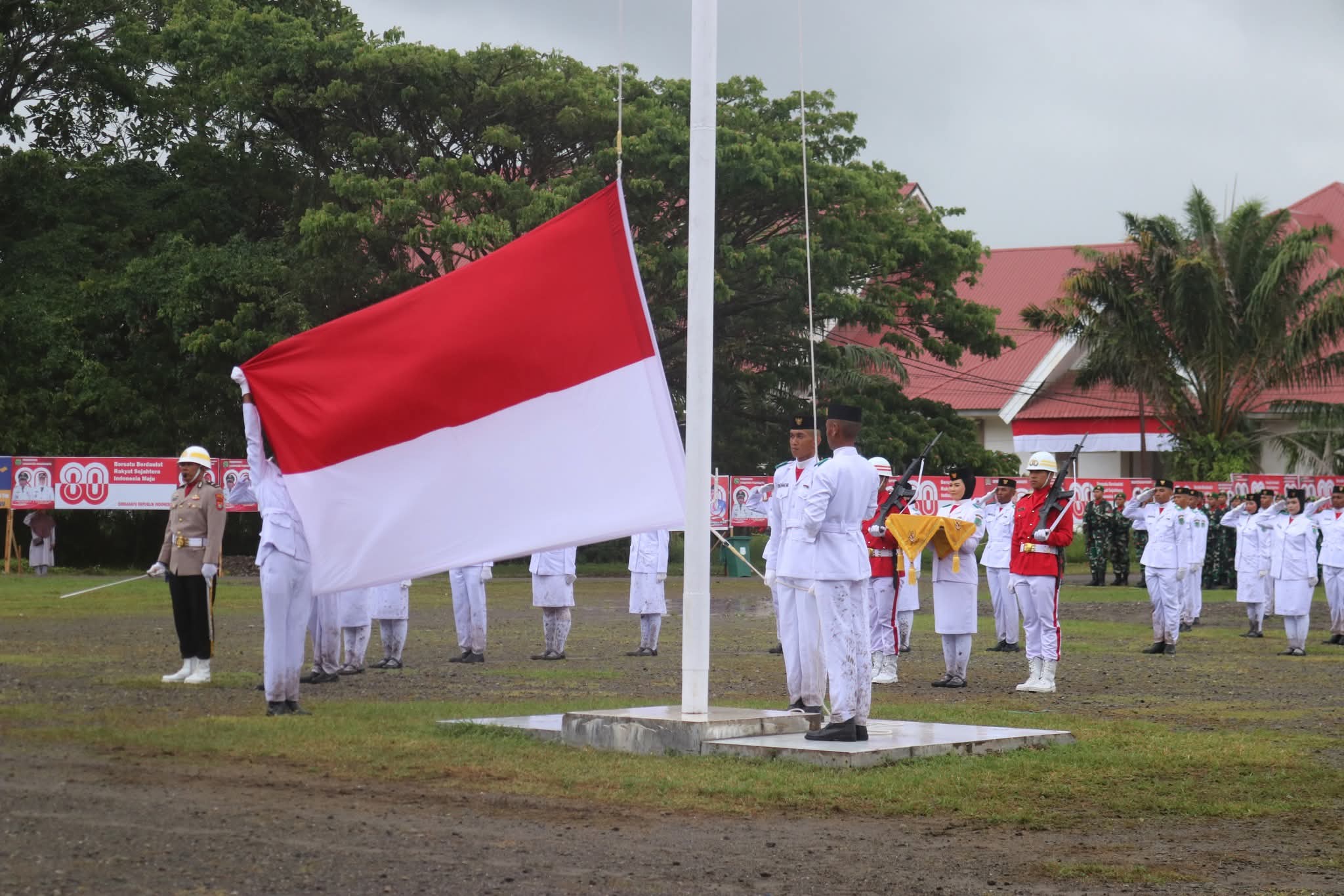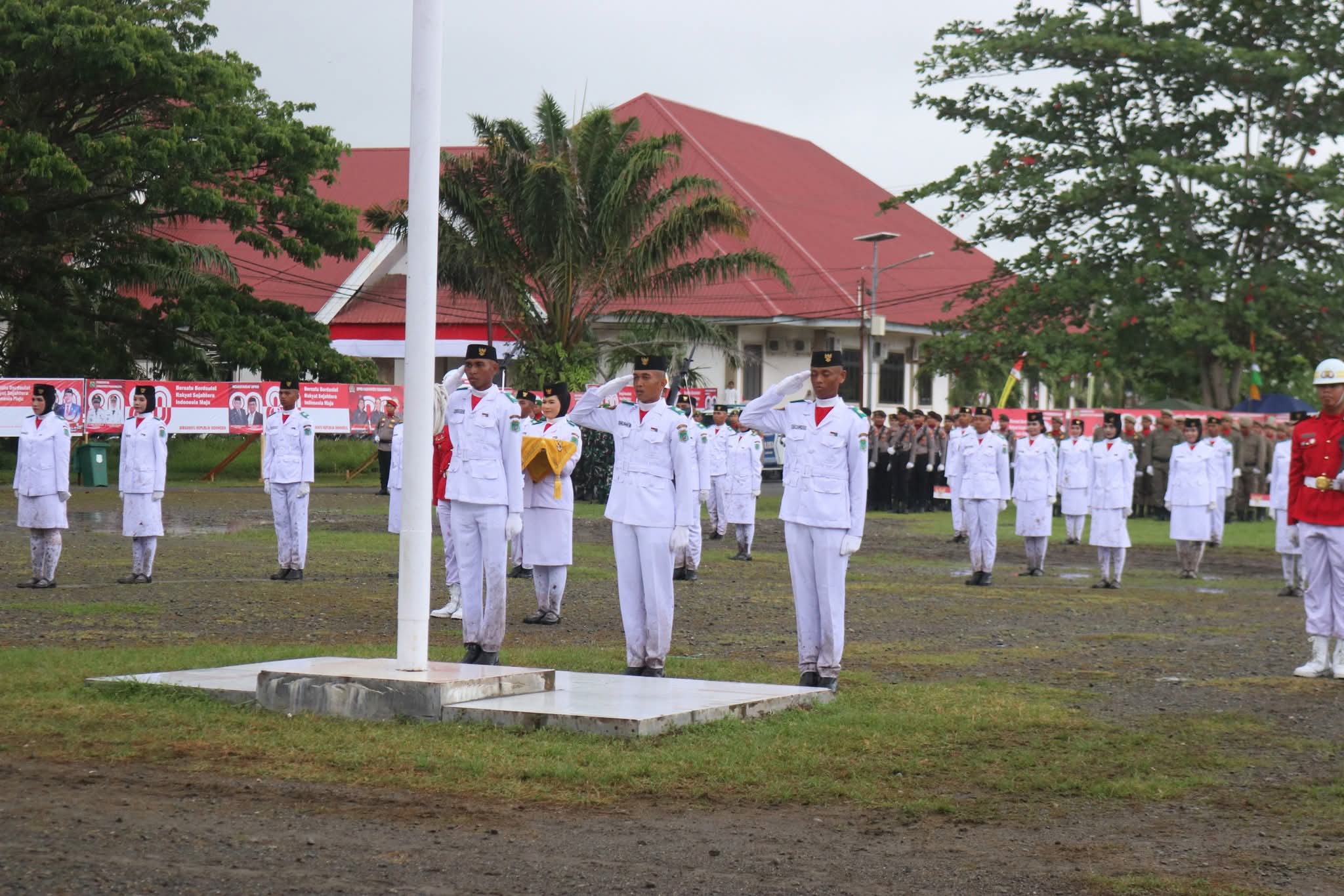 Meskipun Hujan Deras mengguyur lapangan, Para peserta tetap semangat memenuhi lapangan upacara, mulai dari jajaran pejabat pemerintah, anggota TNI-Polri, Serta para pelajar.