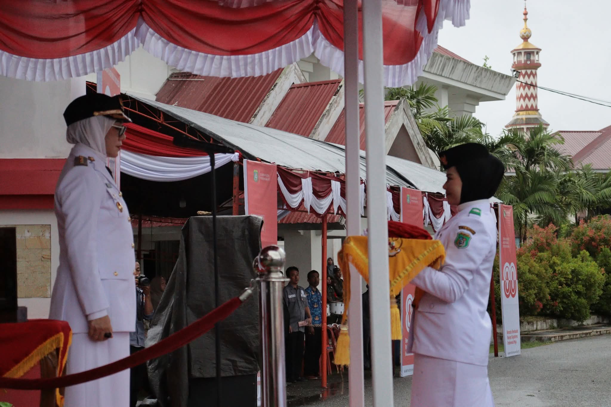 Para pasukan pengibar bendera pusaka (Paskibraka) yang terdiri dari putra-putri terbaik Pasangkayu, dengan langkah tegap dan penuh disiplin, menurunkan sang merah putih diiringi lagu kebangsaan Indonesia Raya.