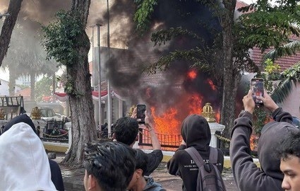 PASANGKAYUNEWS.COM, Jakarta — Bentrokan terjadi saat aksi gabungan masyarakat sipil di Surabaya di depan Gedung Negara Grahadi, Surabaya, Jawa Timur, Jumat (29/8/2025). Api berkobar,Aksi ini dilakukan untuk memprotes kekerasan aparat menyusul tewasnya pengemudi ojek online (ojol) Affan Kurniawan akibat dilindas rantis Brimob di Pejompongan, Jakarta, pada Kamis (28/9/2025), menyusul unjuk rasa di gedung DPR yang berujung ricuh.