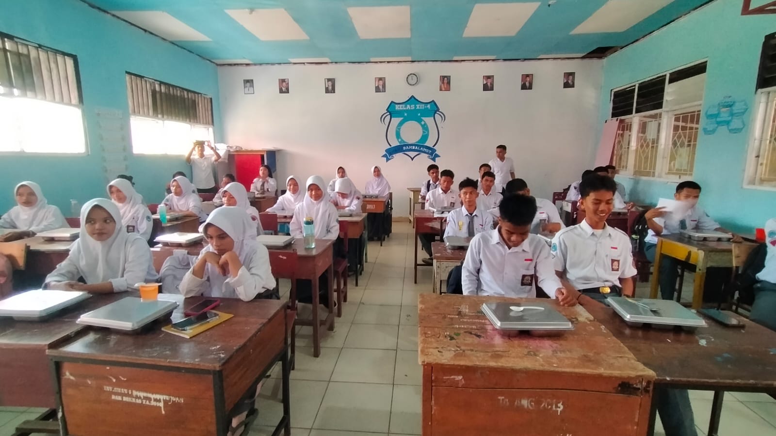 Pada hari perdana, paket makanan yang disiapkan oleh Satuan Pelayanan Pemenuhan Gizi (SPPG) dibagikan secara tertib melalui pengurus kelas, dilanjutkan dengan makan bersama.